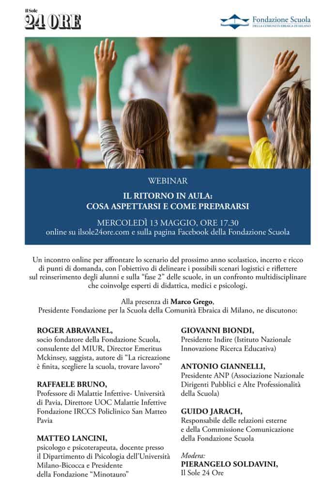 Mercoledì 13 maggio si svolgerà un webinar di confronto organizzato dal Sole 24 ore e dalla Fondazione per la Scuola della comunità ebraica di Milano per affrontare lo scenario del prossimo anno scolastico e delineare i possibili scenari. Il dibattito coinvolgerà diversi esperti di didattica, medici e psicologi, tra i quali Matteo Lancini.