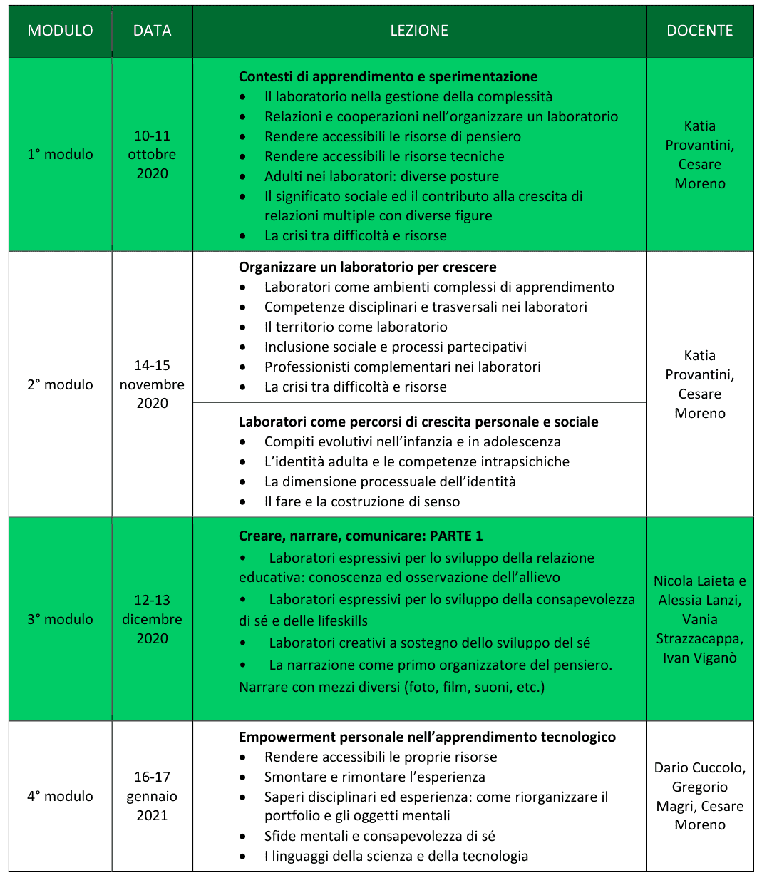 – Acquisire conoscenze teoriche sul dispositivo dei laboratori nei contesti educativi e clinici.