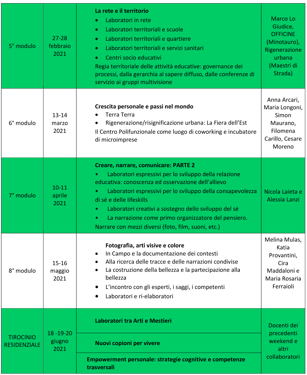 Nel mese di giugno 2021 è previsto un soggiorno residenziale (sede da definire) volto a sperimentare attività pratiche di fotografia, teatro ed empowerment personale, e alla co-progettazione di laboratori per i contesti lavorativi dei corsisti.