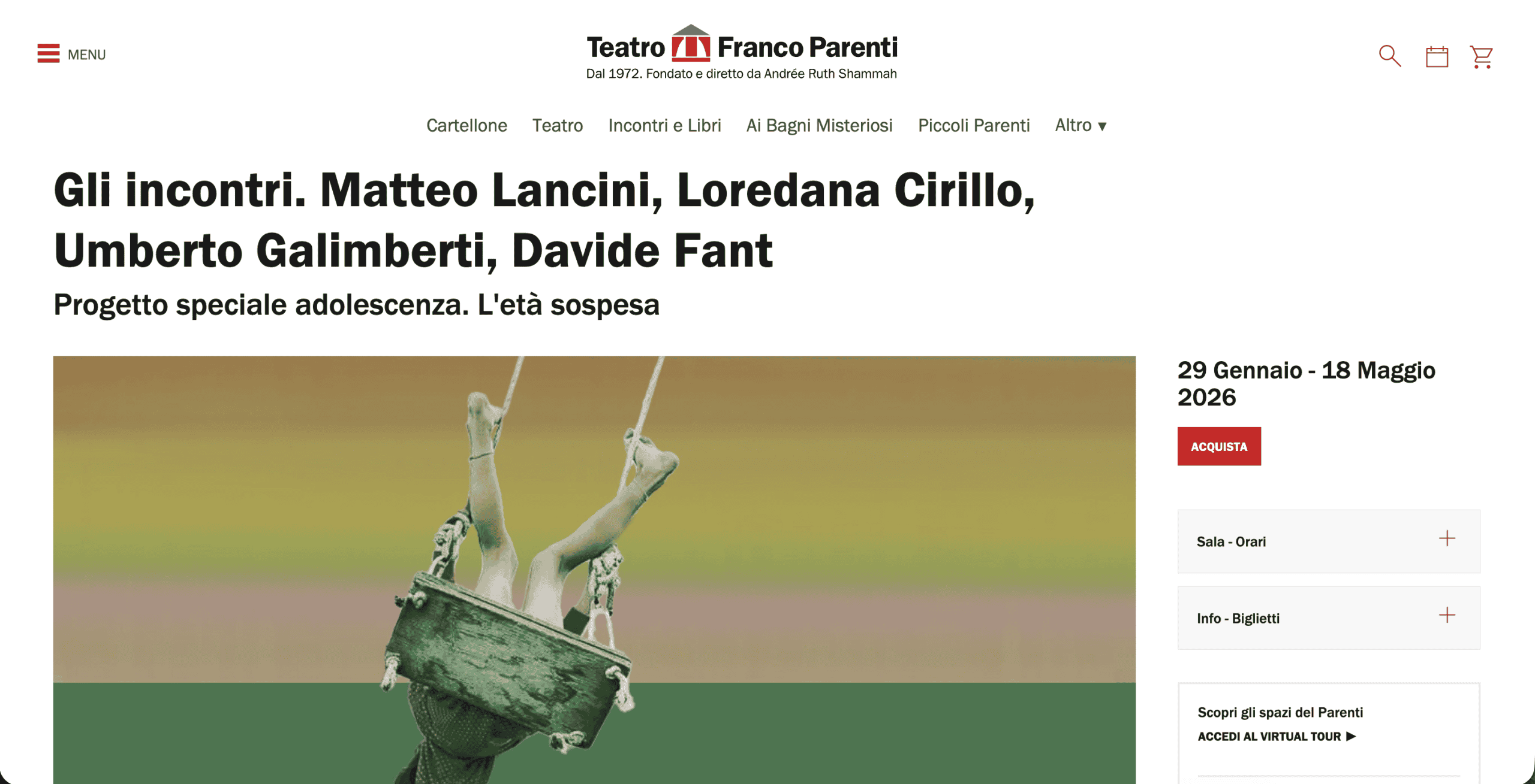 L’iniziativa si svolge presso il Teatro Franco Parenti di Milano dal 29 gennaio al 18 maggio 2026 all’interno del Progetto speciale adolescenza. L’età sospesa e si rivolge a genitori, educatori e operatori del settore.