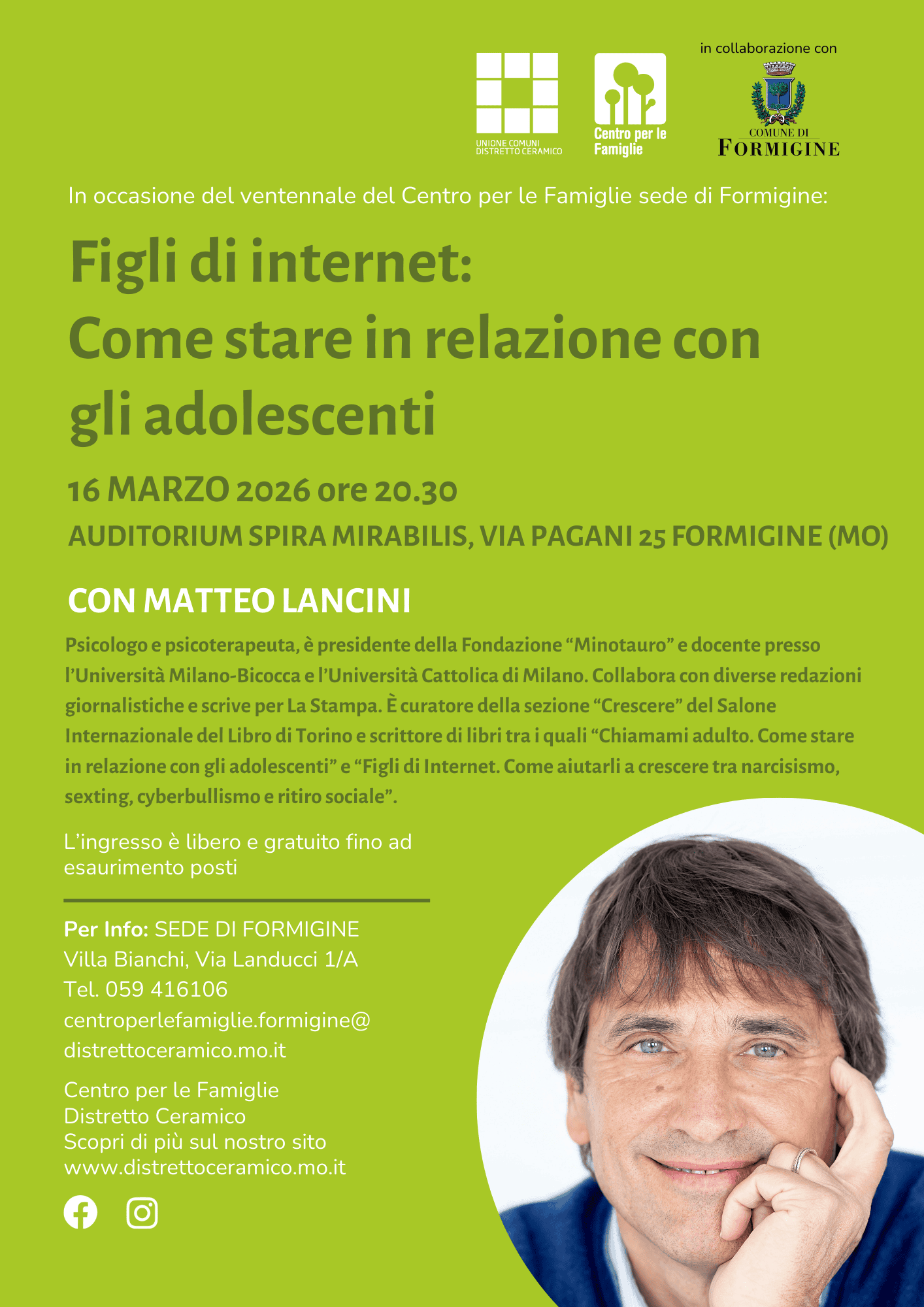 In occasione del ventennale del Centro per le Famiglie – sede di Formigine, si terrà l’incontro pubblico “Figli di Internet: come stare in relazione con gli adolescenti”, con Matteo Lancini.