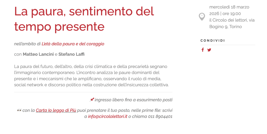 Il 18 marzo 2026 alle ore 19.00, presso il Circolo dei lettori di Torino (via Bogino 9), si terrà l’incontro “La paura, sentimento del tempo presente”, nell’ambito del ciclo “L’età della paura e del coraggio”, con Matteo Lancini e Stefano Laffi.