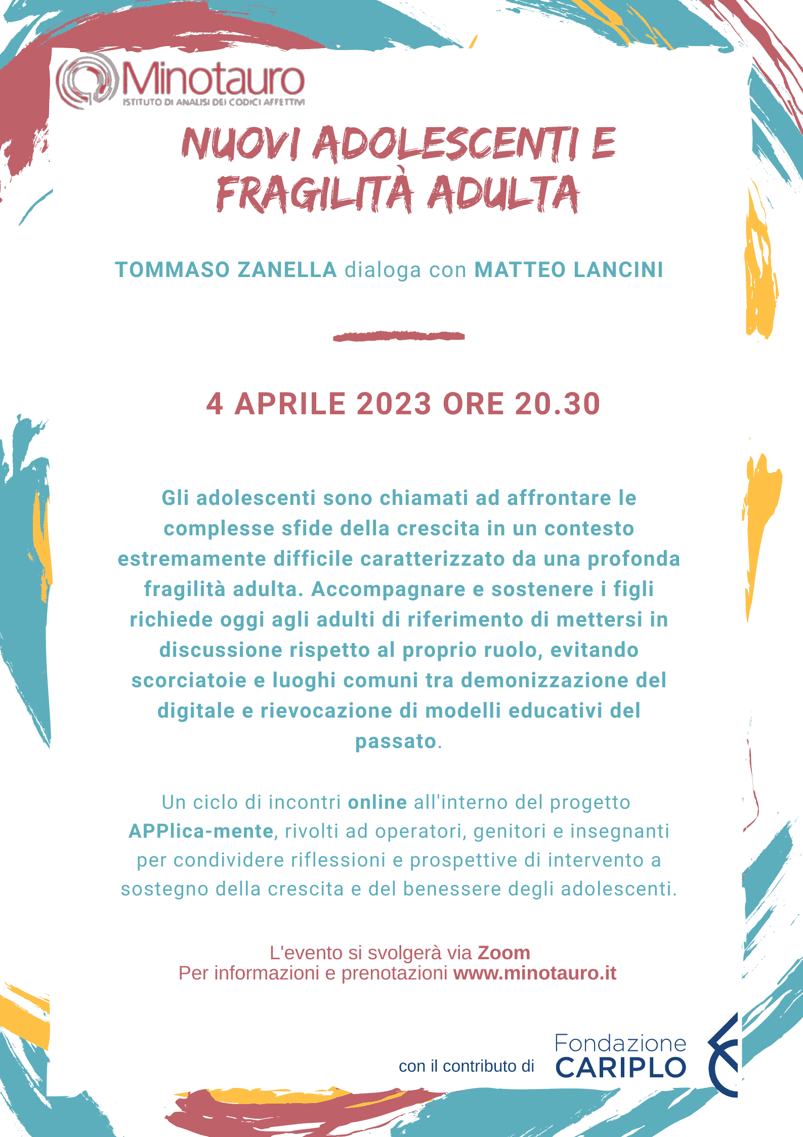 Il primo appuntamento sarà MARTEDì 4 APRILE alle ore 20.30, in cui Tommaso Zanella dialoga con Matteo Lancini su “Nuovi adolescenti e fragilità adulta”.