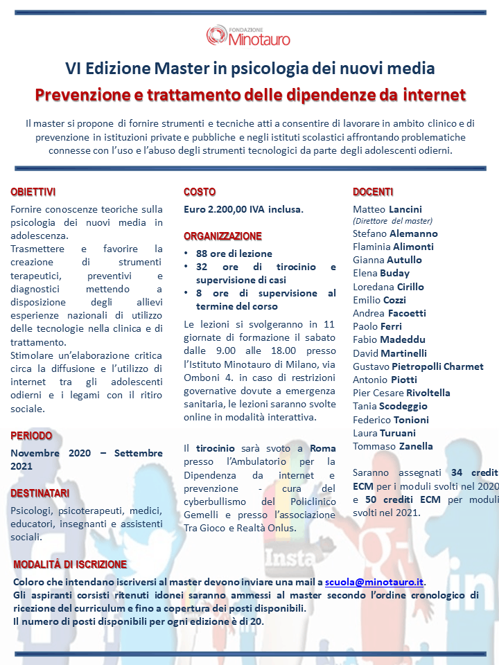 Sono aperte le iscrizioni per la VI edizione del master “Prevenzione e trattamento delle dipendenze da internet in adolescenza”, che si svolgerà tra novembre 2020 e settembre 2021.