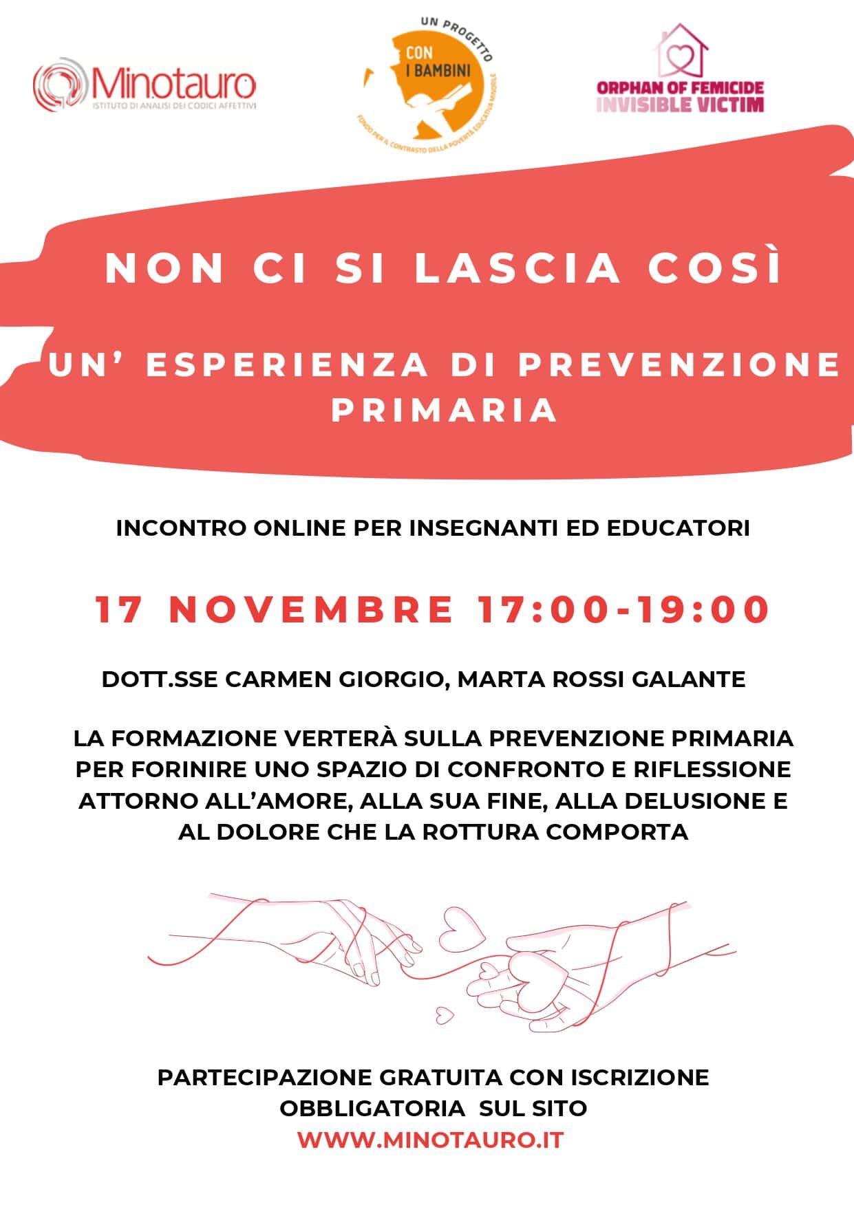 LA FORMAZIONE VERTERÀ SULLA PREVENZIONE PRIMARIA PER FORNIRE UNO SPAZIO DI CONFRONTO E RIFLESSIONE ATTORNO ALL’AMORE, ALLA SUA FINE, ALLA DELUSIONE E AL DOLORE CHE LA ROTTURA COMPORTA