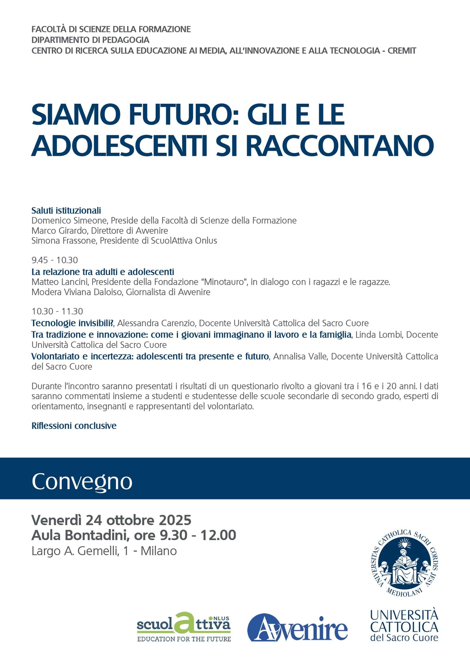 Il 24 ottobre 2025, presso l’Aula Bontadini dell’Università Cattolica del Sacro Cuore di Milano (Largo A. Gemelli, 1), si terrà il convegno promosso dalla Facoltà di Scienze della Formazione, Dipartimento di Pedagogia e CREMIT.