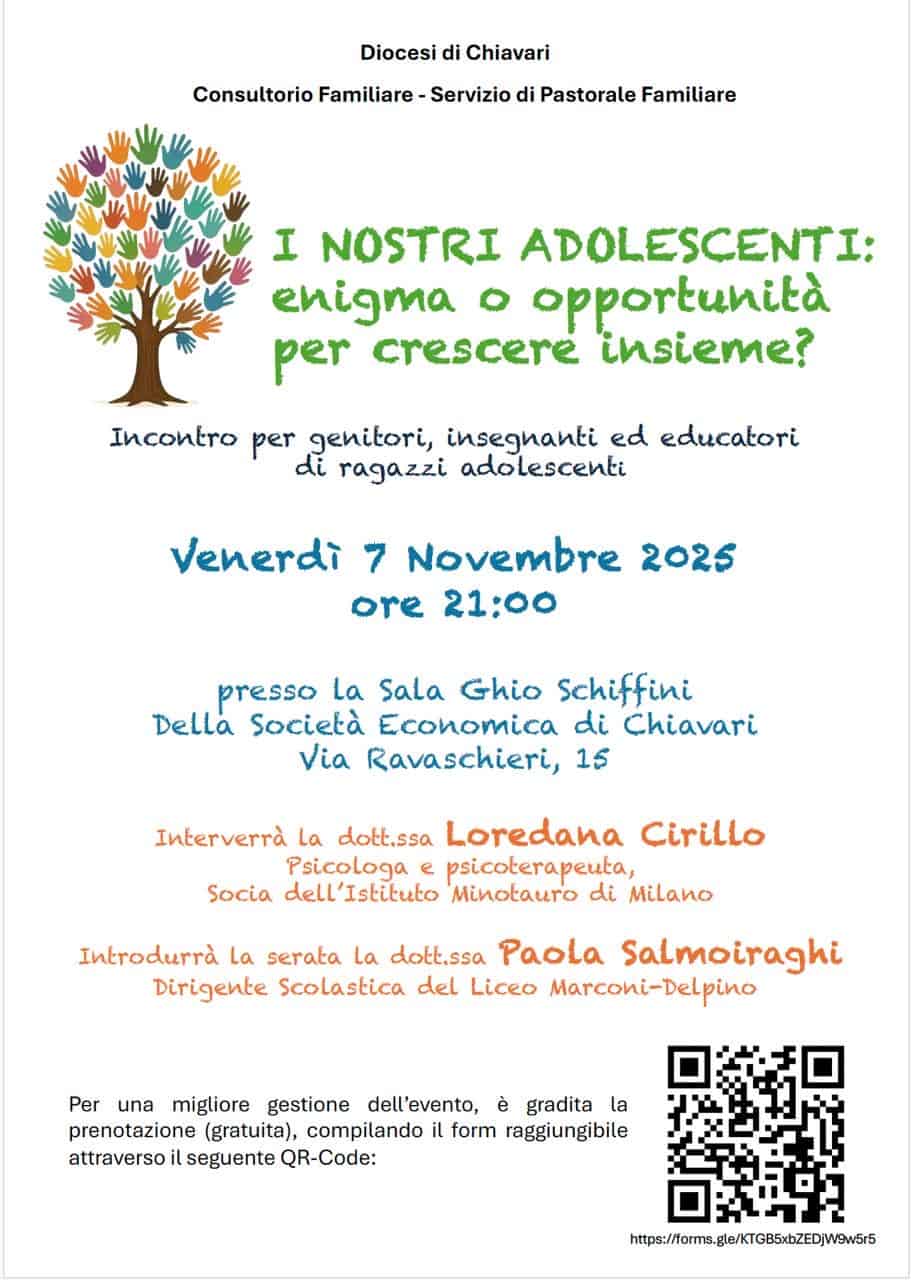 La Diocesi di Chiavari – Consultorio Familiare, Servizio di Pastorale Familiare organizza un incontro rivolto a genitori, insegnanti ed educatori di ragazzi adolescenti dal titolo: