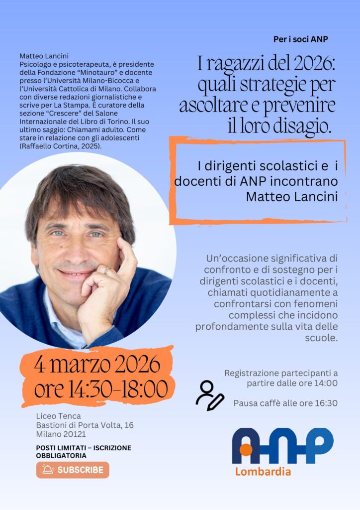 Il 4 marzo 2026, dalle ore 14:30 alle 18:00, si terrà a Milano l’incontro “I ragazzi del 2026: quali strategie per ascoltare e prevenire il loro disagio”, promosso da ANP Lombardia.