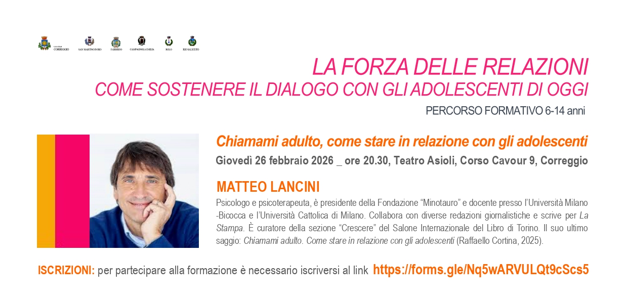 Giovedì 26 febbraio 2026, alle ore 20.30, presso il Teatro Asioli (Corso Cavour 9, Correggio), si terrà un incontro con Matteo Lancini.