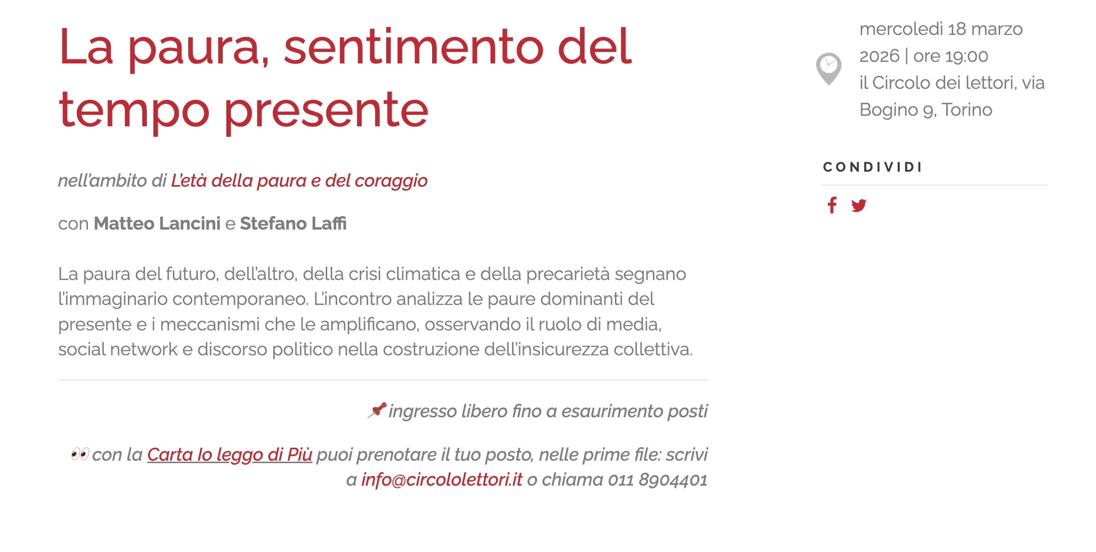 Il 18 marzo 2026 alle ore 19.00, presso il Circolo dei lettori di Torino (via Bogino 9), si terrà l’incontro “La paura, sentimento del tempo presente”, nell’ambito del ciclo “L’età della paura e del coraggio”, con Matteo Lancini e Stefano Laffi.