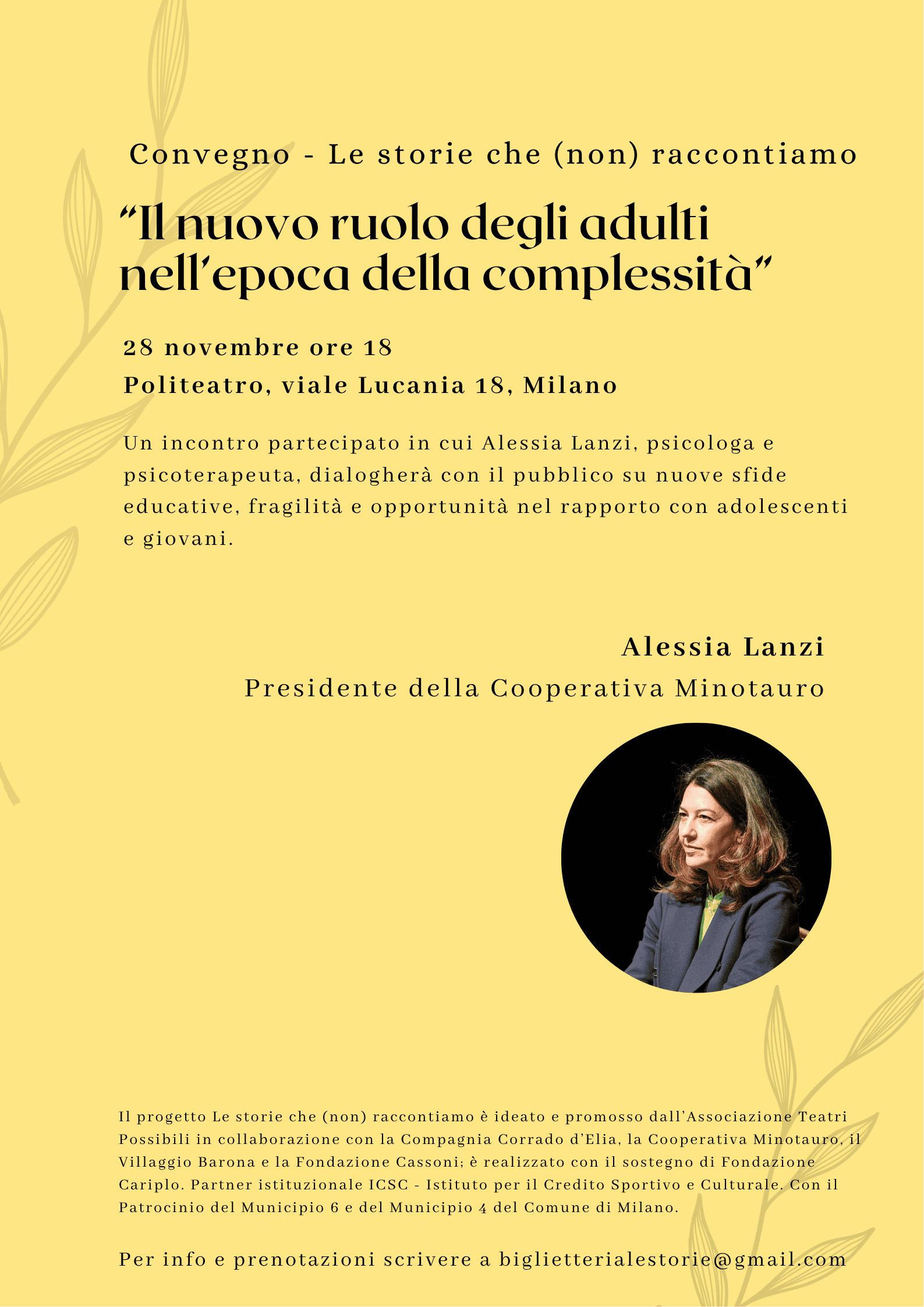 Nell’ambito del progetto Le storie che (non) raccontiamo, la Cooperativa Minotauro partecipa al convegno “Il nuovo ruolo degli adulti nell’epoca della complessità”, in programma giovedì 28 novembre alle ore 18 presso il Politeatro, in viale Lucania 18, Milano.