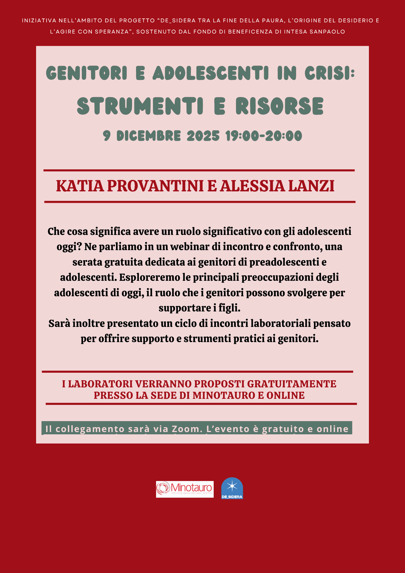 INIZIATIVA NELL’AMBITO DEL PROGETTO “DE_SIDERA TRA LA FINE DELLA PAURA, L’ORIGINE DEL DESIDERI E L’AGIRE CON SPERANZA”, SOSTENUTO DAL FONDO DI BENEFICENZA DI INTESA SANPAOLO