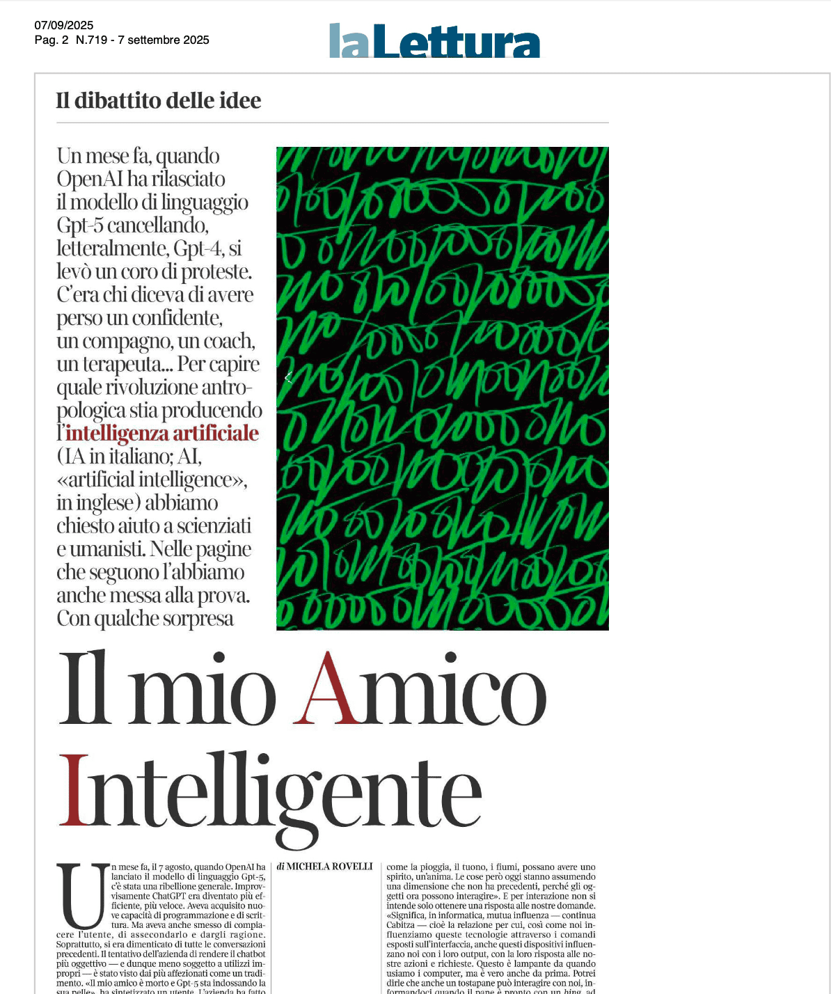 Un mese fa, quando OpenAl ha rilasciato il modello di linguaggio Gpt-5 cancellando, letteralmente, Gpt-4, si levò un coro di proteste. C’era chi diceva di avere perso un confidente, un compagno, un coach, un terapeuta… Per capire quale rivoluzione antropologica stia producendo l’intelligenza artificiale (IA in italiano; AI, «artificial intelligence», in inglese) abbiamo chiesto aiuto a scienziati e umanisti. Nelle pagine che seguono l’abbiamo anche messa alla prova. Con qualche sorpresa