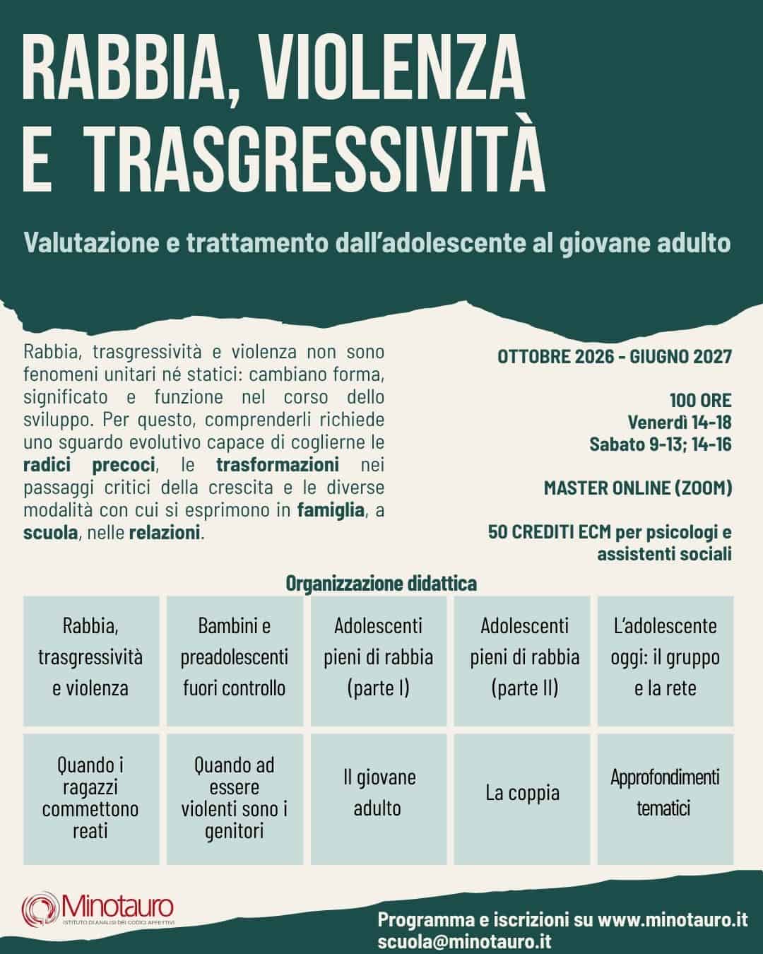 A partire dai contributi sulla comprensione della rabbia, sull’origine della violenza e sulle basi neurobiologiche del comportamento aggressivo, il programma si sviluppa attraversando i principali snodi clinici dell’adolescenza, con attenzione al ruolo della famiglia e al lavoro con i servizi.